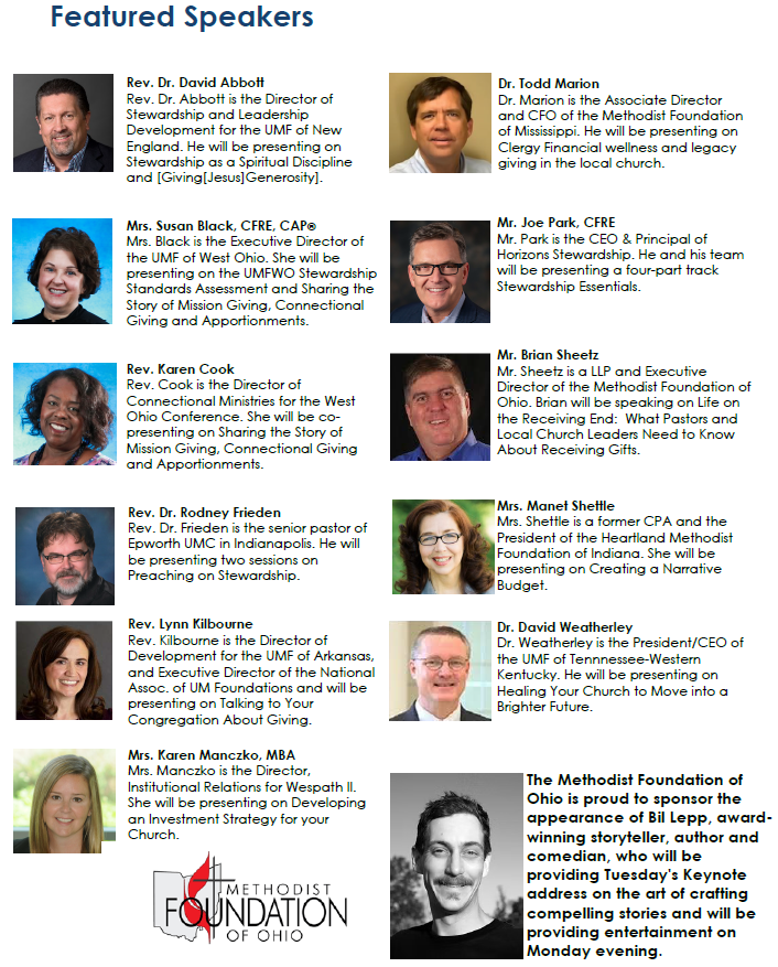 The event featured 11 sessions over a two-day period on topics related to the Foundation’s Generosity Abounds! stewardship curriculum. After hearing from keynote speaker Rev. Dr. Ken Sloane of UMC Discipleship Ministries on the state of stewardship in the church today, attendees learned about culturally appropriate stewardship, clergy finance best practices, inspiring generous giving, navigating campaigns in the local church, congregational financial literacy, legacy giving, stewardship in the extraordinary church, and maximizing church endowments. The event featured speakers from three other United Methodist Foundations as well as West Ohio clergy, Wespath representative Karen Manczko, and Horizons Stewardship CEO Joe Park.